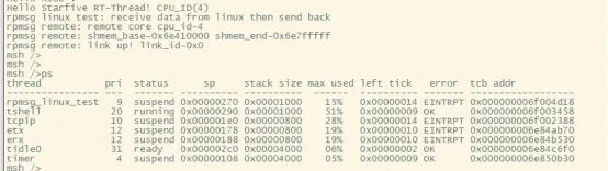 RT-Thread接受到IPI中断后,rpmsg_linux_test会继续执行,这时RT-Thread的finsh shell也能正常使用。