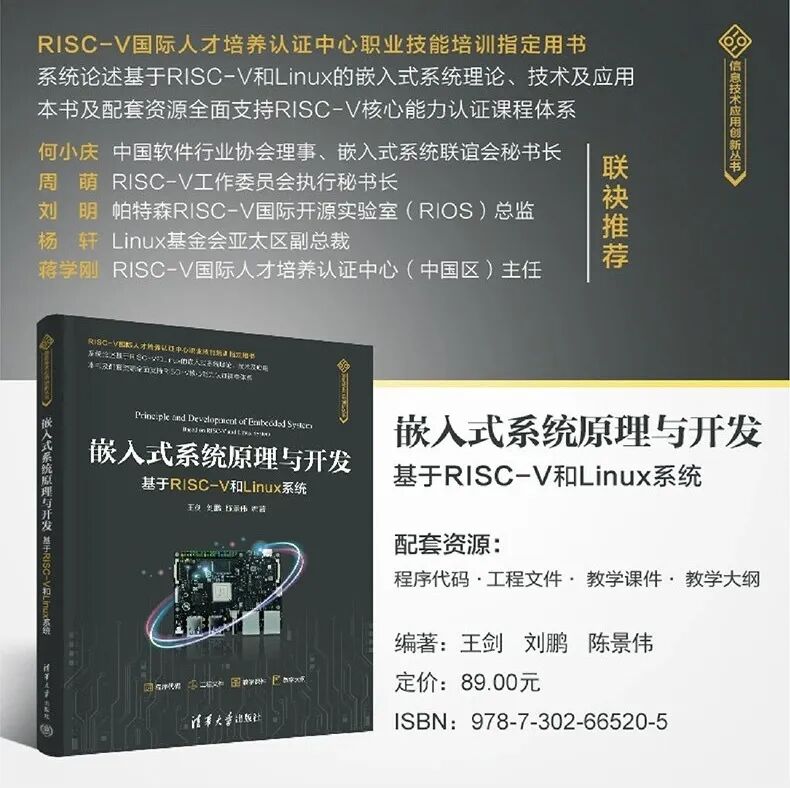 “王剑老师长期从事嵌入式系统教学工作,这次与赛昉科技合作,将其成熟的嵌入式Linux课程移植到赛昉科技昉·星光 2的RISC-V单板机上。本书是一本全新处理器体系架构的嵌入式教材。RISC-V嵌入式应用广泛且深入,本书的出版对RISC-V开发者和高校教师将有非常大的帮助,将为RISC-V生态繁荣作出贡献。”